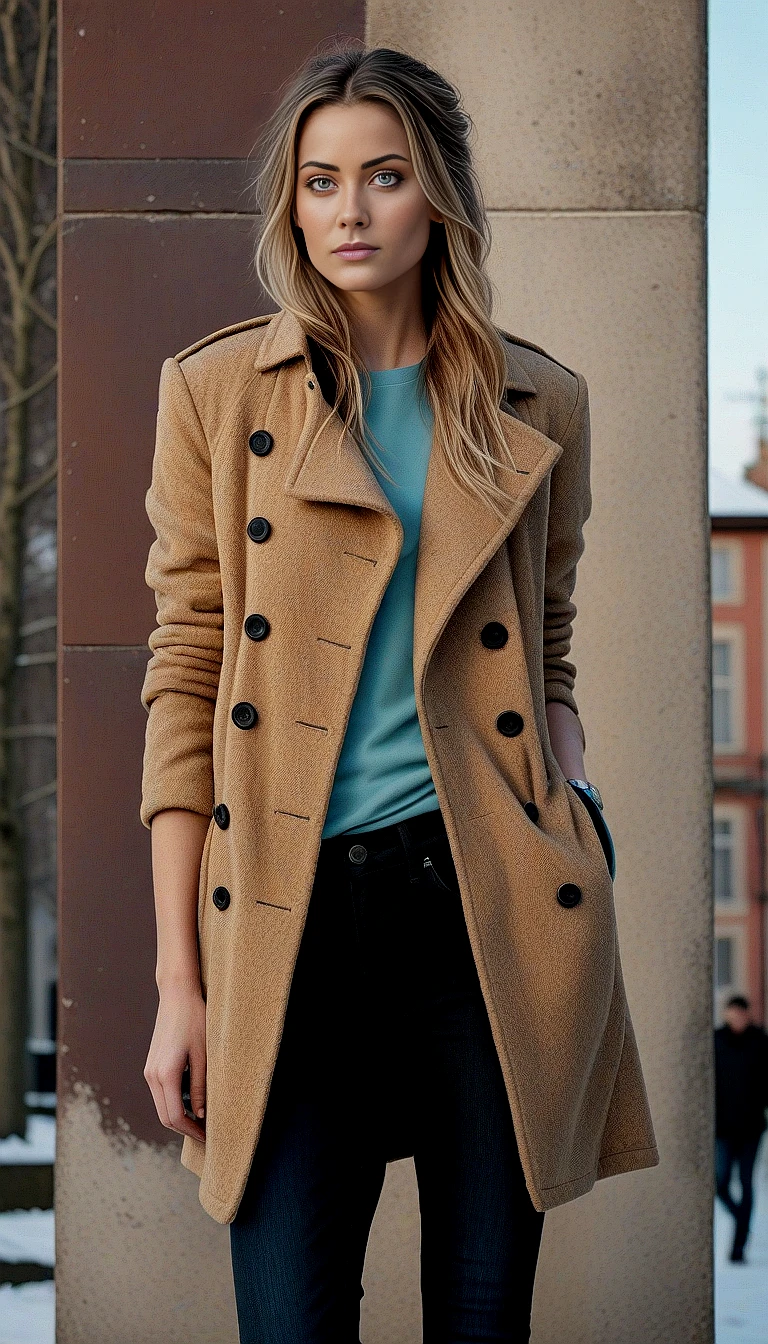 A woman with straight, slightly wavy blonde hair framing her face stands directly facing the camera, head turned a touch to her right. Her eyes are captivating, with a neutral expression. She wears a teal top, black pants, and a tan double-breasted pea coat with large buttons, open at the front. Her left hand is partially inserted into her coat pocket, and her right arm is bent, with her hand resting on the coat.