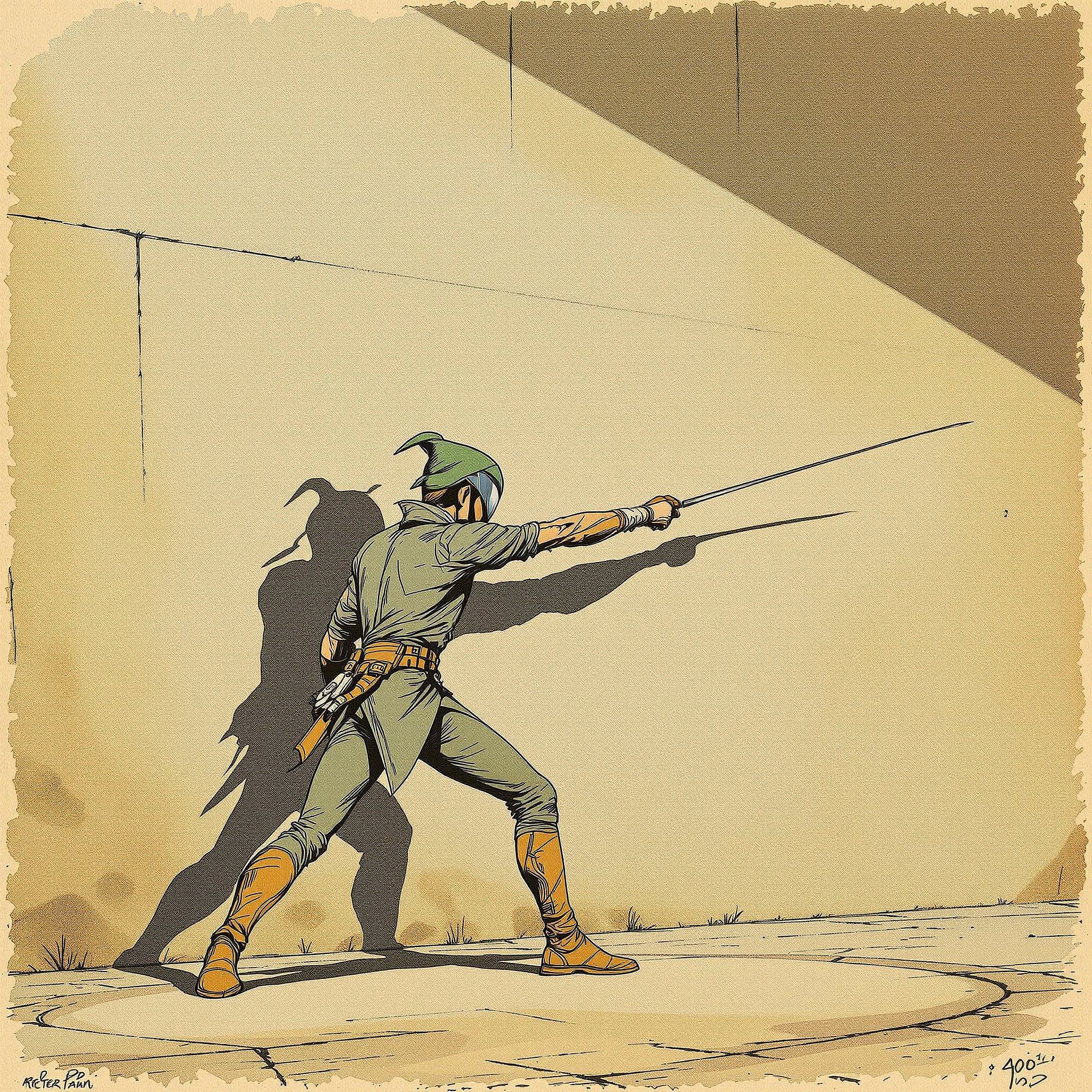 Photorealistic , full body shot of peter pan fencing with his shadow against a wall, hand drawn, in the form of an old drawing, extremely detailed, in the style of Moebius, Metal Hurlant, Heavy Metal comic, full color, grain effects, film effects --no helmet --chaos 35 --ar 4:5 --stylize 400 --v 6. 1