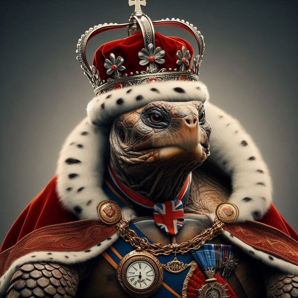 A photorealisitic professional photograph of an anthropomorphic tortoise King of England