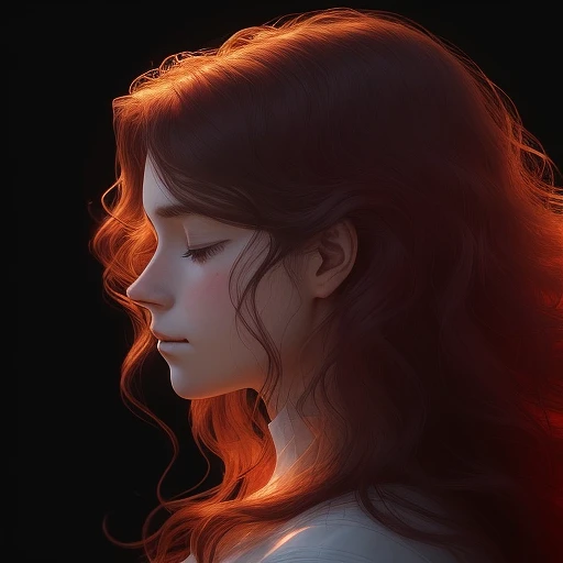 A vertical image of a serene woman in profile. Her features are soft and detailed against a dark background. She has wavy hair that flows upwards, outlined with a vibrant red glow that gives the impression of a glowing aura. Her eyes are gently closed, and her expression is one of deep tranquility.