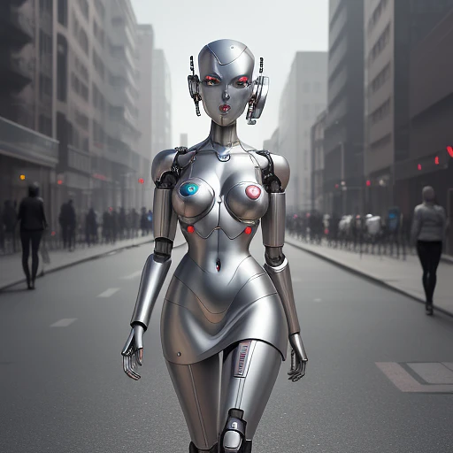 atomic heart, robot, cyborg, android, faceless, shiny silver metal body, mini skirt, walking on the street, city background, (((full body visible) )), looking at viewer, portrait, photography, detailed skin, realistic, photo-realistic, 8k, highly detailed, full length frame, High detail RAW color art, piercing, diffused soft lighting, shallow depth of field, sharp focus, hyperrealism, cinematic lighting, <lora:atomicHeartRobotMaid_001:0. 6>