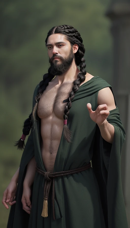 A 24 year hold man. He is of medium height, with green eyes and black hair. His hair is shoulder length and thickly braided. He has a beard pulled into two braids which reach to his collar bone. He is of a wiry, athletic build and is wearing arcane robes.
