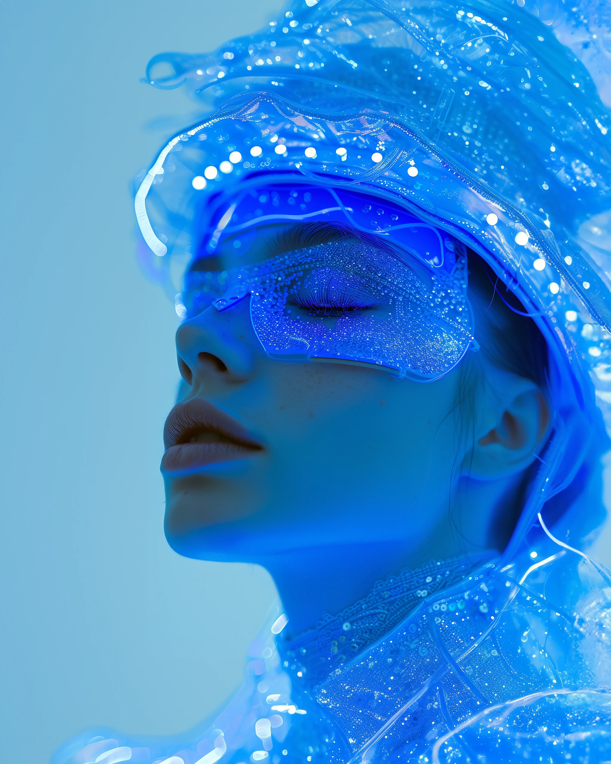 a woman in a costume wearing a blue light, in the style of textural layers, kaja foglio, harry bertoia, hyperreal, backlight, neon-lit urban, american barbizon school --ar 21:32 --s 250 --v 6. 0 --style raw
