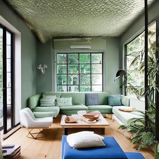 high resolution photography interior design, dreamy sunken living room conversation pit, wooden floor, small windows opening onto the garden, bauhaus furniture and decoration, high ceiling, beige blue green pastel palette, interior design magazine, cozy atmosphere