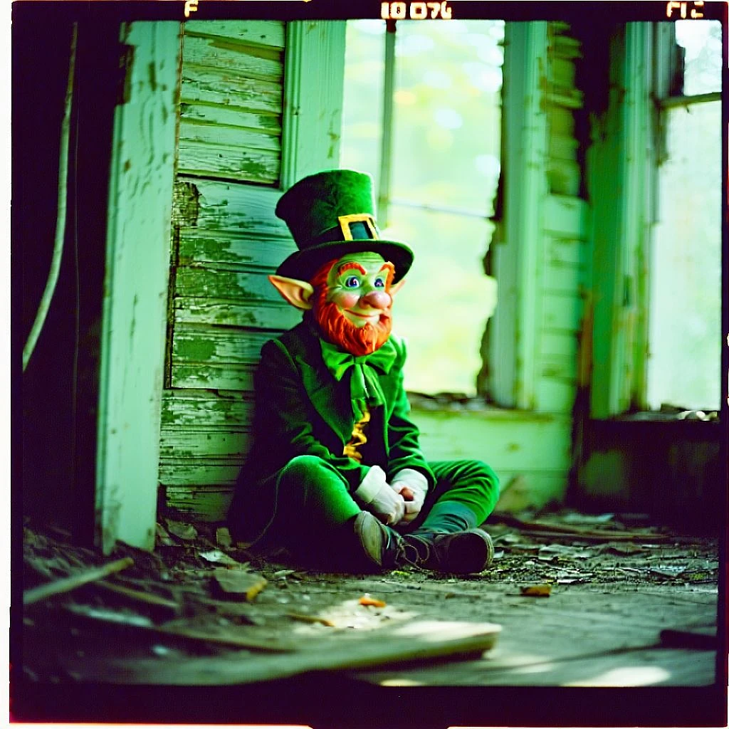 grainy 80's photograph quality polaroid of a leprechaun caught in an abandoned house, dark, uncanny