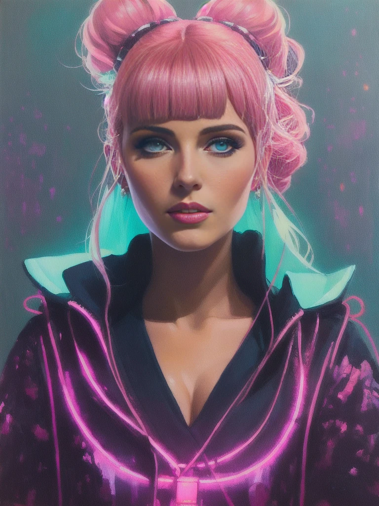 1 girl, Cobie Smulders, Christina Hendricks as Padmé Amidala with pink hair, vivid colors, stunning eyes, amazing eyes, lying, A futuristic place full of cables with lots of neon lights and led lighting , elaborate blue theme dress, one piece character, simetric body, full body, extremely detailed, cinematic lighting, high contrast, artstation, Illustration, Portrait, Oil Painting, Norman Ackroyd, John Blanche