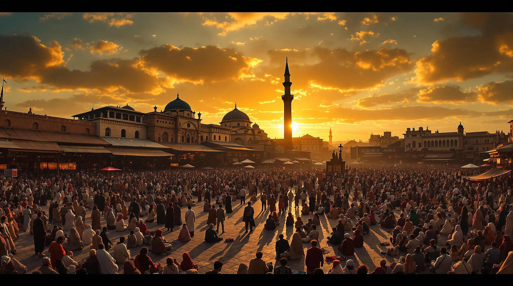 a wide-angle photograph of a bustling medieval marketplace at sunset, with a large crowd of people gathered in the foreground. The crowd is diverse, with people of all ages and genders, dressed in a variety of attire, including traditional clothing and dress. Some people are sitting on the ground, while others are standing or walking. In the background, there are several buildings, including a large mosque with a tall minaret and a dome-shaped roof. The sky is a deep orange and yellow, with clouds scattered throughout. The lighting is warm and golden, with long shadows cast across the ground. The camera used is likely a wide-angle lens, which captures the expansive scene and emphasizes the depth and distance of the image.