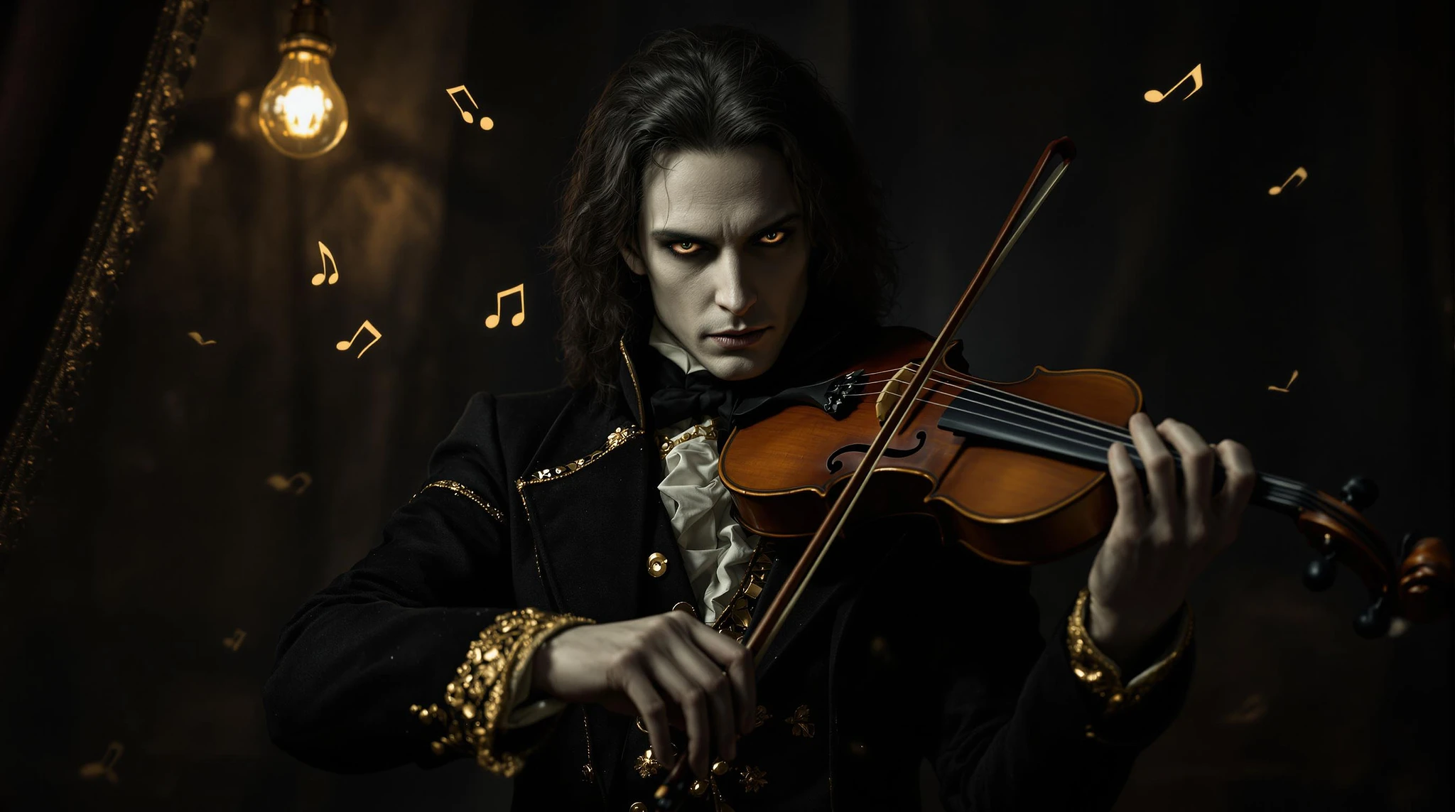 Create a hyperrealistic image of Niccolò Paganini, the famous 19th century violinist. He must be represented in a dark and dramatic environment, with dim lights that illuminate his figure. Paganini must be dressed in an elegant costume of the time, with details elaborated in the wardrobe that reflect his extravagant style. * Characteristics of the environment: * - * Background: * A gloomy setting with heavy curtains and an atmosphere full of mystery. - * Lighting: * A soft light bulb that highlights his pale face and intense eyes, suggesting an air of melancholy and genius. - * Additional elements: * Elongated shadows, an ancient violin in his hands, and musical notes floating in the air, evoking the idea that he is playing a hypnotic melody. * Image quality: * - * Resolution: * 8K to ensure the greatest clarity and detail. - * Style: * Photorealism, with an emphasis on facial details and wardrobe textures. - * Color: * Predominant dark tones with gold or silver accents for wardrobe details.