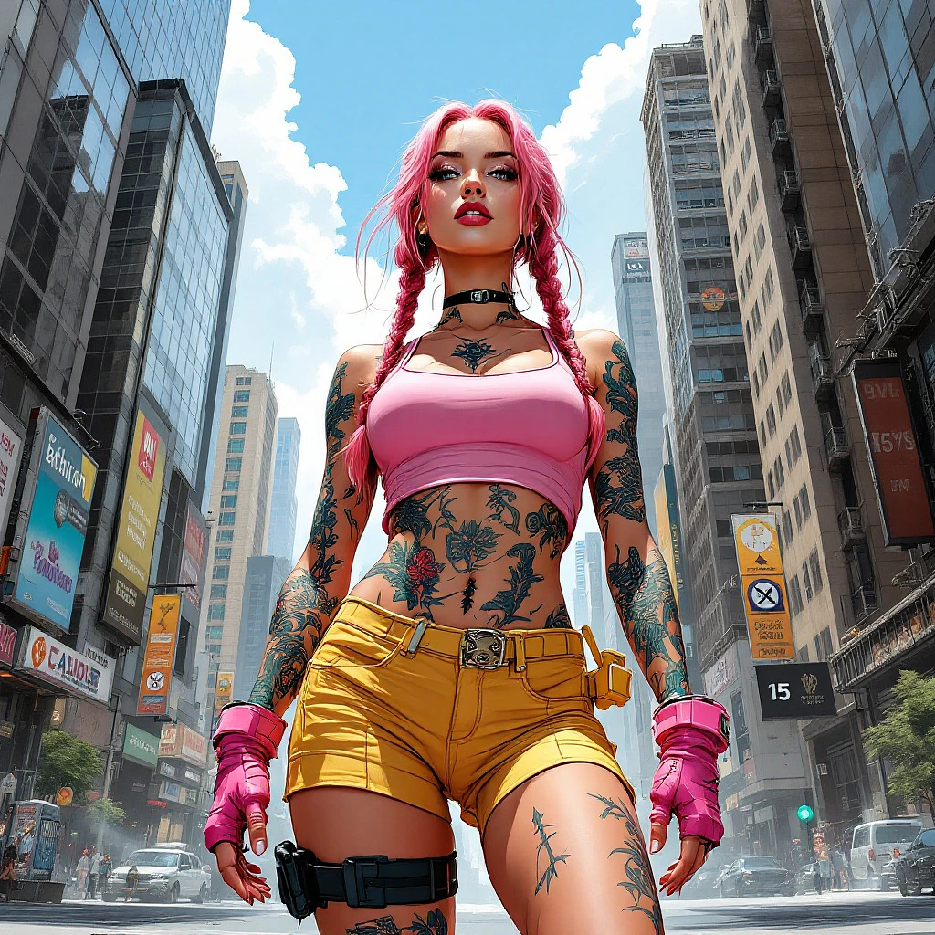 Realistic comic book illustration of young beauty European girl with pink hair with two braids standing in the middle of a city, low angle viev, color tattoos, ultra-short pink top tank, ultra-short yellow shorts, pink fingerless gloves, comic book cover, dynamic art, action pose, black outline, comic style, sci-fi, mechanized precision, meticulous detail, by Travis Charest style, by Frank Cho style --ar 4:5 --s 450 --v 6. 0