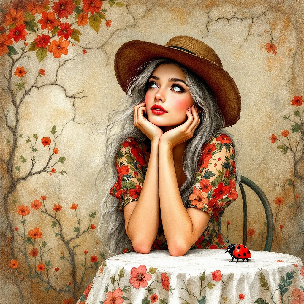 Painterly art, a whimsical yet realistic scene in ink, chalk and watercolour, A serene portrait of a young woman with long, flowing silver hair, sitting gracefully in a bright floral dress adorned with red flowers. She is wearing a wide-brimmed hat and resting her chin on her hand, gazing thoughtfully at a vibrant ladybird perched on a table beside her. The background features a cracked, textured wall that adds an artistic touch to the scene. The atmosphere is tranquil and dreamy, capturing a moment of quiet contemplation in a beautiful, nature-inspired setting.
