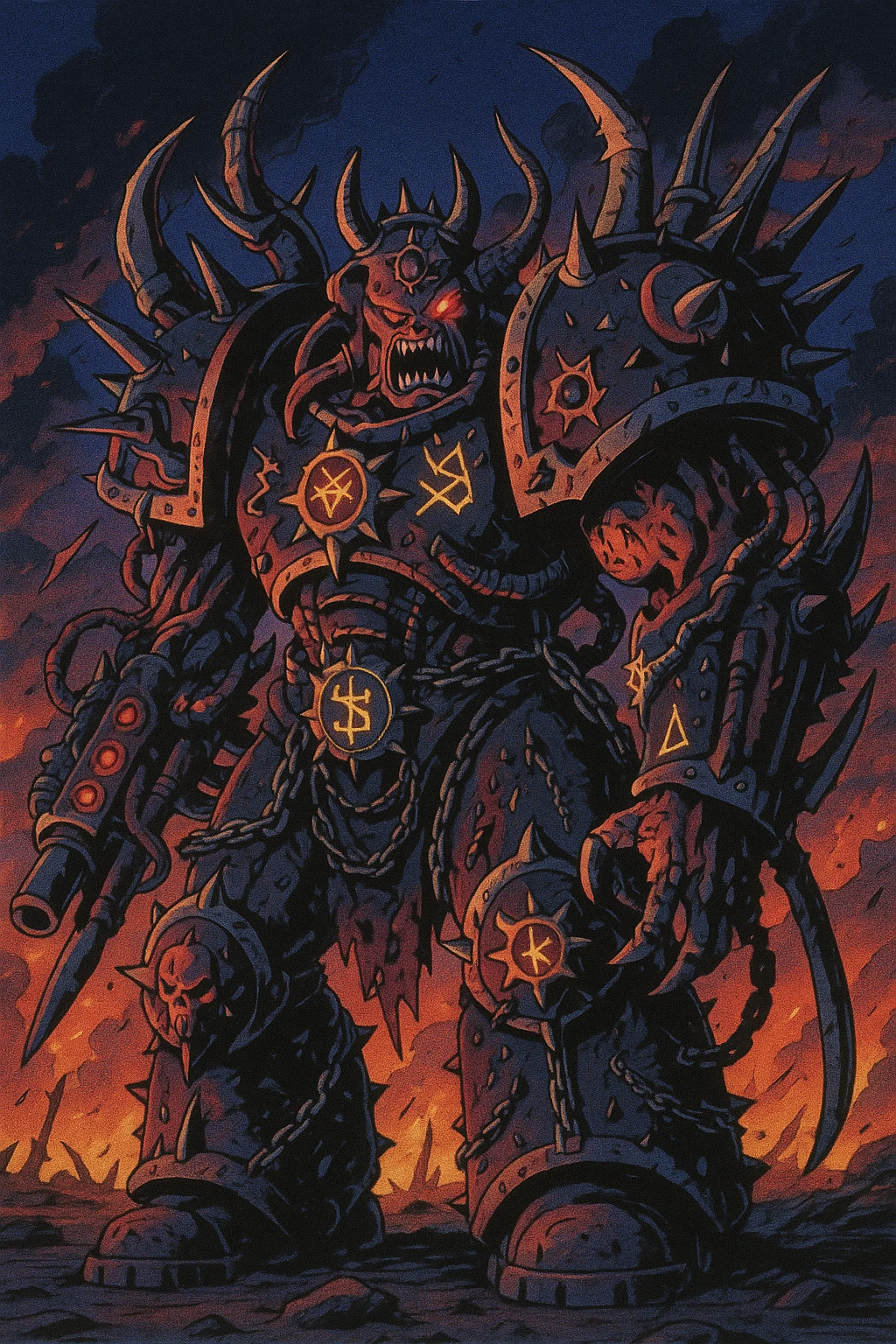 Chaos Obliterator from Warhammer 40K, a massive mutated warrior fused with twisted power armor and grotesque biomechanical weapons growing from his body — living guns, cannons, and blades merging with flesh. Dark, menacing aura, covered in Chaos symbols and glowing runes, spiked armor, chains, and cables. Retro anime style, bold 80s–90s hand-drawn look, dramatic cel shading, neon highlights, apocalyptic battlefield background with fire and smoke, VHS grain aesthetic.