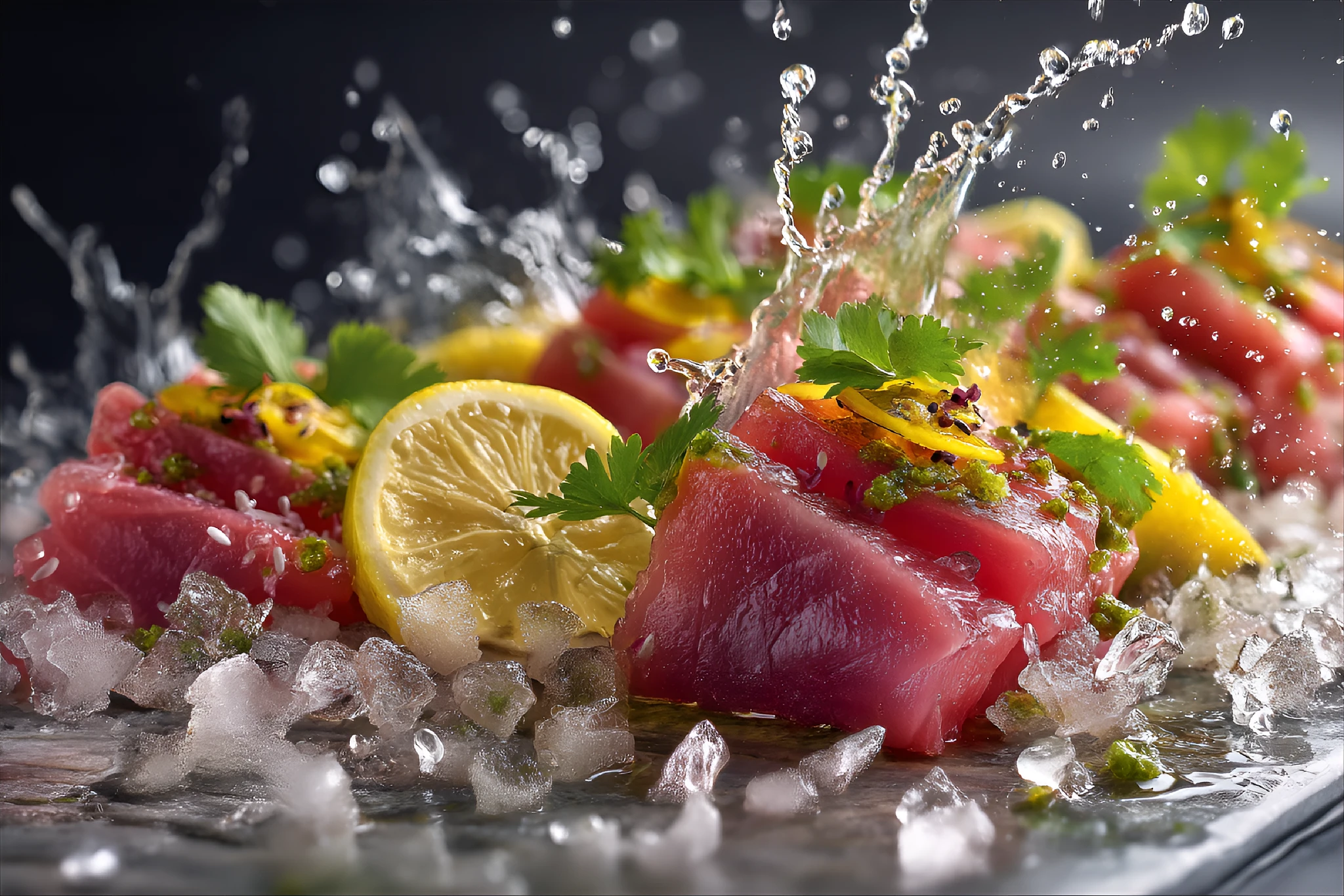 vibrant fresh sashimi slices surrounded by water splashes, garnished with fresh green cilantro and yellow lemon slices, placed on a bed of ice cubes