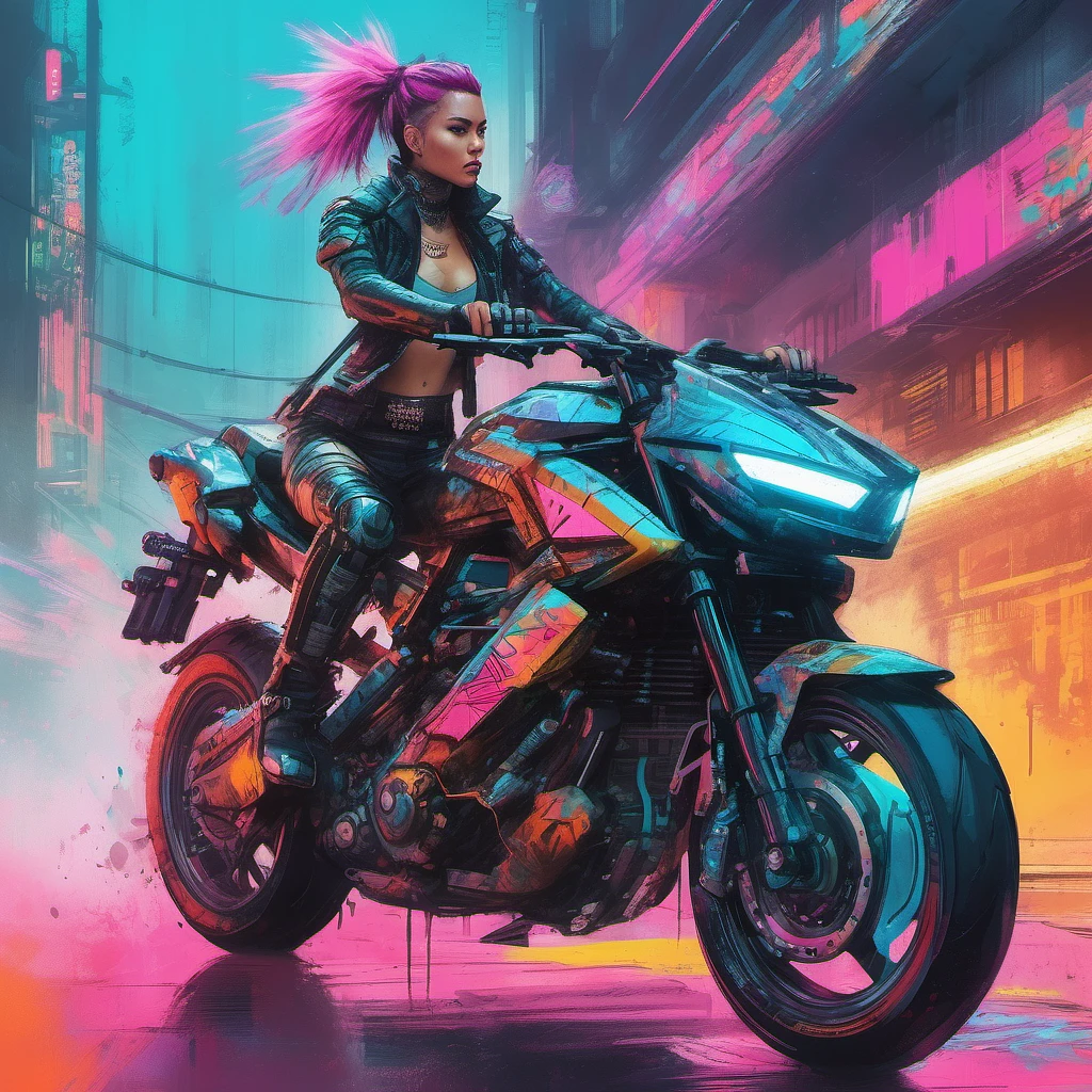 a young punk woman riding a futuristic sports bike, ((cyberpunk armored outfit)) , armored , have 2katanas, complex artistic colorful ink painting, brushstrokes, concept art, haze, ultra-detailed, film photography, light leaks, sharp focus, studio photo, intricate details, highly detailed, by greg rutkowski