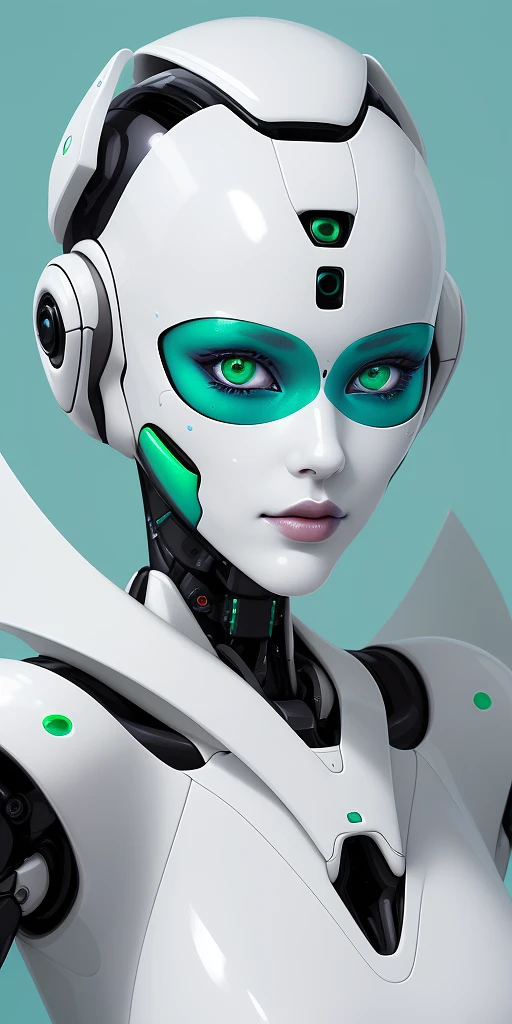 close-up portrait of a female with a glossy white futuristic robotic design on her face, featuring smooth panels and subtle ceramic textures, contrasting with vibrant green human eyes and lips, set against a pale blue background, merging high-tech with human features --ar 9:16