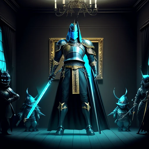 black knight with gold sword at his side in a darck room. with monsters surrounding him. glowing cyan eyes all arownd him