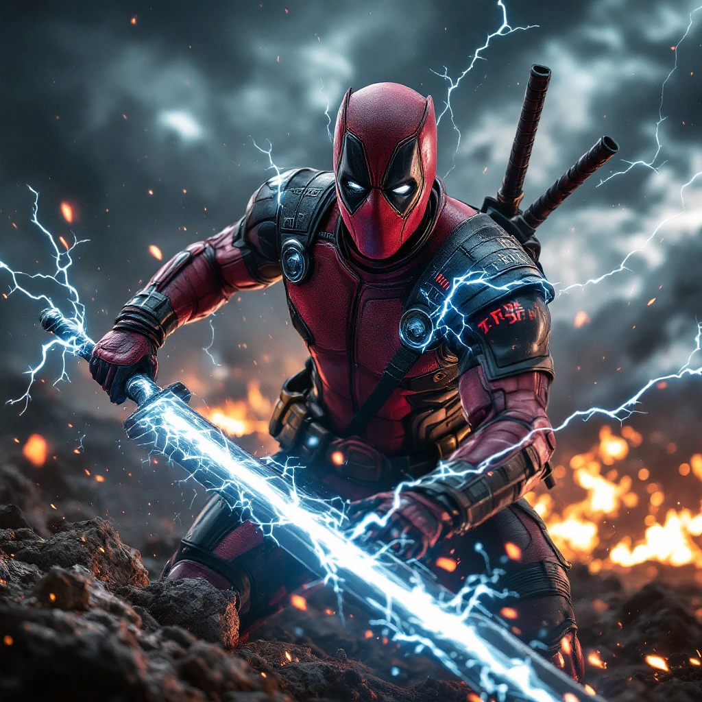 A hybrid superhero combining Deadpool and Thor, red tactical armor with glowing Norse runes, wielding a hammer-sword hybrid crackling with lightning, half-scarred masked face, stormy battlefield background, cinematic lighting, photorealistic style, dramatic clouds and sparks flying, --style raw --ar 16:9 --v 7