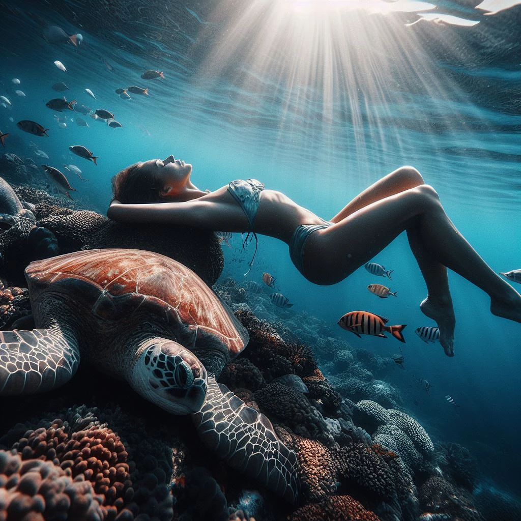 astonishing underwater photography, masterpiece, best quality, photorealism, sharp focus, high camera angle, ultra realistic, real life, hyper detailed, perfect proportions, mesmerizing woman peacefully freediving alone, high detail skin, carribean sealife with turtles, tropical fishes, corrals, golden sunlight rays, beautiful dramatic lightning