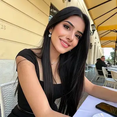 beautiful latina woman, 22 years old, long straight black hair, soft natural makeup, big brown eyes, smiling, wearing a black dress, black nails, sitting at a café table, soft lighting, sunny background, instagram selfie style, ultra realistic