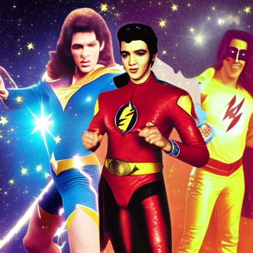 Elvis Presley in a superman, prince in a Batman suit holding a yellow guitar, Whitney Houston dresses as Wonder Woman singing, Tupac as robot cyborg with a machine gun arm, David Bowie as the flash covered in lighting and Kurt Cobain is Aquaman holding a guitar in a shape of a pitchfork . . . all together as a team of music super heroes