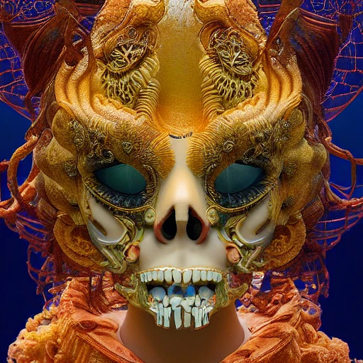 3 d goddess close - up frontal portrait with ram golden skull. beautiful intricately detailed japanese fractal jellyfish kitsune mask and clasical japanese kimono. betta fish, jellyfish fractal, bio luminescent, plasma, ice, water, wind, creature, mandelbulb, fractal, artwork by tooth wu and wlop and beeple and greg rutkowski