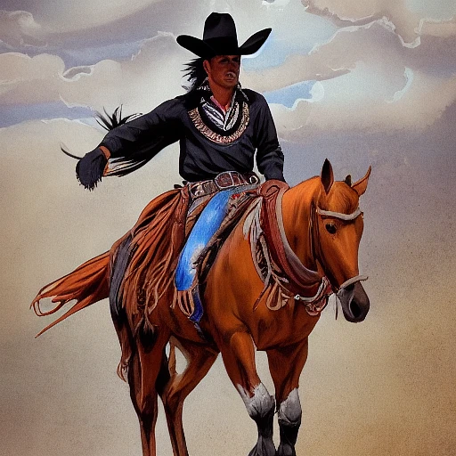 **On the t-shirt, depict a skilled vaquero, a Mexican cowboy, in a dynamic pose. He should be wearing traditional vaquero attire, including a wide-brimmed sombrero, a serape (a colorful Mexican blanket worn over the shoulders) , leather chaps, and riding boots. The vaquero should be riding a powerful and majestic horse, both in motion. The horse can be adorned with traditional Mexican horse tack, such as a beautifully decorated saddle and bridle. In the vaquero's hand, place a carefully detailed revolver, symbolizing his expertise with firearms. It should be a classic Western-style revolver, with engraved details and a wooden grip. Mexican landscape in the background, such as desert scenery or distant mountains