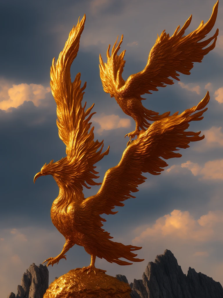 A majestic phoenix with vibrant plumage, its fiery wings spread wide, golden feathers illuminating against a dark sky, perched atop a rugged mountain peak, surrounded by swirling clouds, capturing the phoenix's grace and intensity, Sculpture, bronze casting, 8k high definition --ar 1:1 --v 5