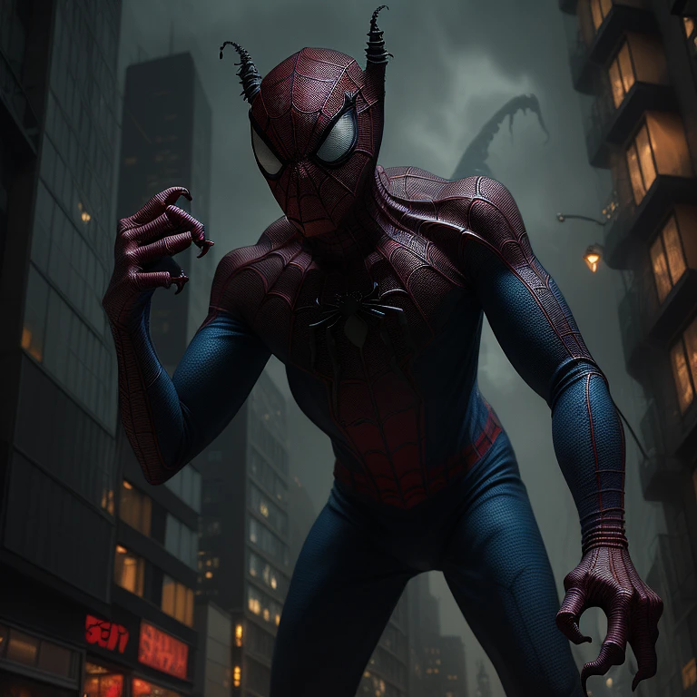 haunting alien with spiderman costume creature that looks like a monstrous giant shrew with many fangs, reddish eyes, urban avenue, modernist buildings from the year 1900, two parked cars, night scene, intricate details, rich textures, wide shot, cinematic, dark lighting, high detail, hd, photo, digital art, fantasy, ((best quality) ), ((masterpiece) ), (high-resolution:1.2)