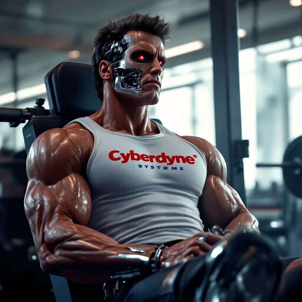 A hyperrealistic 1980s-style cinematic scene showing the Terminator from The Terminator movie seated on a bench press machine during a pause between sets in a classic 80s-style gym. He is wearing a retro, tight-fitting muscle shirt with the Cyberdyne Systems logo prominently displayed on the chest. The shirt clings to his powerful frame, with every muscle beneath the fabric well-defined and emphasized, exuding a sense of raw strength and precision. Paired with this, he wears classic 80s-style athletic shorts and high-top sneakers, completing his iconic look. The Terminator's hands rest powerfully on his thighs, palms relaxed yet strong. His hands are large, with anatomically correct features: five fingers per hand, detailed knuckles, visible veins running over the muscular surface, and a subtle metallic sheen emerging at the knuckles and joints where his advanced robotic endoskeleton is exposed beneath the skin. The transition from organic skin to advanced metal is seamless, smooth, and polished, reflecting the advanced engineering of his design. The bench press barbell is loaded with four 20 kg weight plates on each side, emphasizing his commitment to a heavy lifting session. The gym itself is a nostalgic retro 80s masterpiece, with atmospheric lighting, iconic retro gym equipment, and a gritty yet motivational ambiance. In the background, a single glowing neon sign prominently displays the phrase 'No Pain, No Gain' in large, bold lettering. This sign is the sole text in the scene, casting a vibrant neon glow that reflects off the misty air and gym equipment. The gym environment itself remains free of additional text or signs, focusing purely on atmosphere and mood. Sarah Connor, portrayed by Linda Hamilton, is performing yoga gracefully in a classic 80s-inspired fitness outfit—high-waisted spandex leggings, a vibrant crop top, leg warmers, and a retro headband. Her movements are precise and elegant, embodying strength, discipline, and style as she stretches through a classic yoga pose. She is softly illuminated by the neon reflections, creating a seamless blend of atmosphere and aesthetics. The gym is enveloped in a misty, neon-lit ambiance. Volumetric lighting breaks through the haze, casting sharp, dramatic beams of light that illuminate the Terminator's muscular physique, his partially metallic features, and Sarah Connor's graceful yoga practice. This lighting creates an atmospheric, cinematic experience, highlighting the retro-futuristic nature of this 80s-inspired scene. Every detail is rendered in stunning hyperrealism—the texture of the muscle shirt, the glint of polished metal peeking through the skin, the alignment of weight plates, the folds of Sarah Connor's classic 80s outfit, and the soft glow of neon reflections. The scene evokes a retro action nostalgia while focusing on the Terminator's mechanical determination and Sarah Connor's strength and poise. This immersive 1980s cinematic masterpiece is a detailed vision inspired by the classic action film aesthetic.