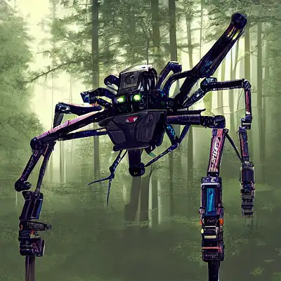 symbolism, 80k hyperrealism, a large poorly made cyberpunk robotic spider war machine battles in the enemy army in the forest, high details, photorealism, real photo --ar 11:1 --uplight