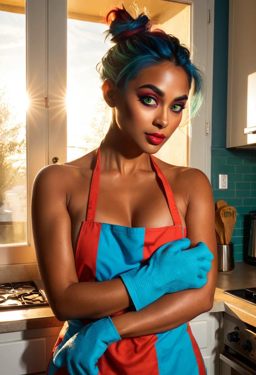 Advertising poster style A striking woman of mixed heritage, her hair styled in a messy bun and streaked with vibrant red and blue hues, stands in a sunlit kitchen with golden hour lighting casting warm shadows across her face and arms. Her deep green eye color and full, slightly upturned lips create a magnetic presence as she holds an oven mitt over a baking tray filled with fresh cookies. , <lora:xl_more_art-full_v1,:1> . Professional, modern, product-focused, commercial, eye-catching, highly detailed