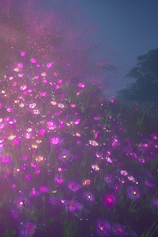 Luminescent flowers blooming at twilight, cgsociety, r /art, trending on artstation, artstationHD, octane render, 3D, unreal engine