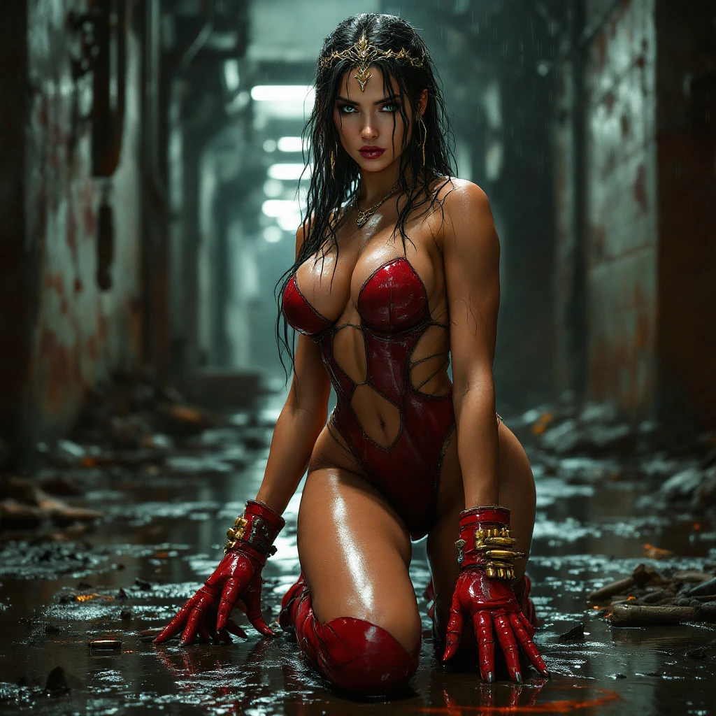A photorealistic warrior girl kneels in a gritty underground factory, wearing a wet leotard and red boots, with a determined expression. Dramatic lighting highlights her muscular yet feminine form, tanned skin glistening, showcasing long legs and curvaceous features, complemented by a tiara and bullet-repelled cuffs. Rich colors and detailed textures create a stunning, dynamic atmosphere.