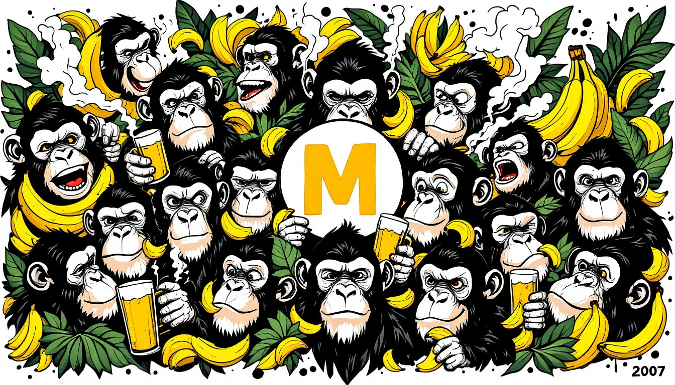 An intricate and mainly black, white, yellow, green, (two contrasting, extra colors for details) , graffiti-style poster featuring various elements, such as a cluster of chimp cartoon characters, symbols of urban culture, smoke and dynamic expressions, focusing on minimalistic chimp faces, the letter 'M' inside a circle bananaleaves, bananas, beer, is part of the image. the word and '2007' is hidden --ar 63:128 --stylize 750