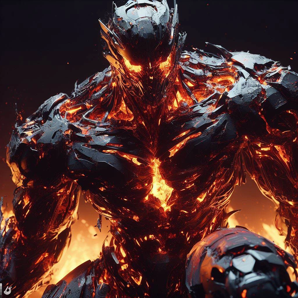 3d render, best quality, ultra realic, ultimate detailed, half-body shot : charismatic muscular humanoïd vilain robot rising from the ashes of a burning destroyed futuristic world, fire flesh, sharp lines, dark reflecting materials, intricate tiny details, realistic natural textures, high level of reflections