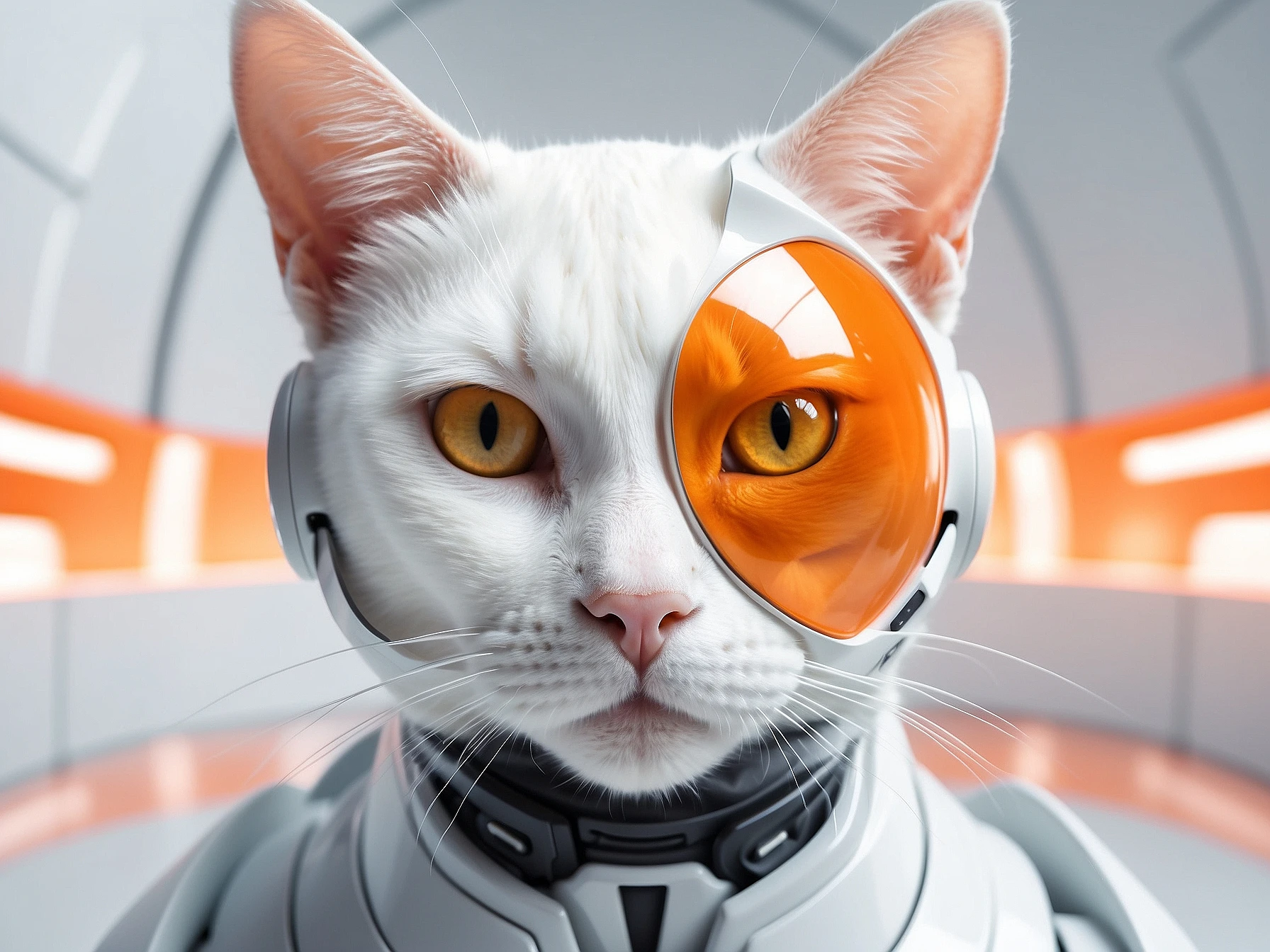 a white cat with orange eyes wearing a helmet, a computer rendering by Mike Winkelmann, shutterstock contest winner, retrofuturism, future tech, uhd image, sci-fi