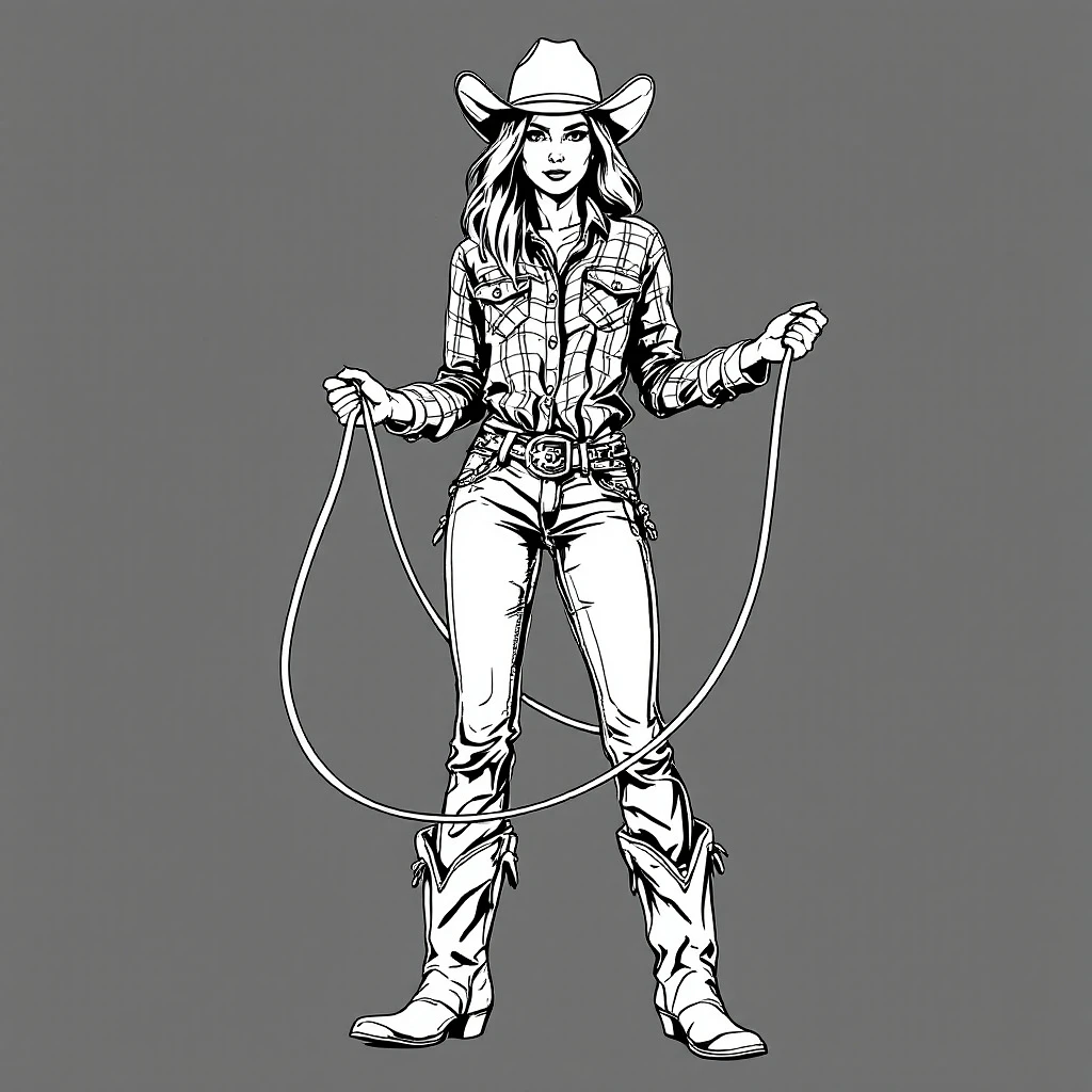 "Classic cowgirl holding a lasso with both hands, standing with boots together, flannel shirt tucked into jeans, bold contour line drawing, no background clutter"