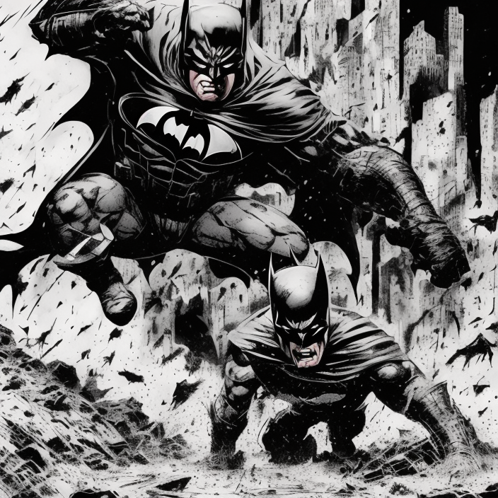 Openjourney prompt: Style of Frank Miller pen and ink, Dark Knight Ret...