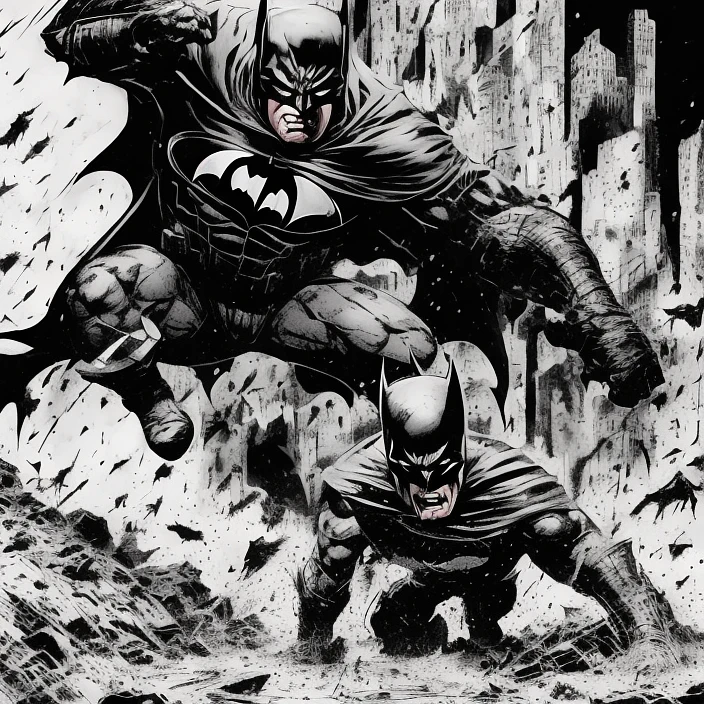Style of Frank Miller pen and ink, Dark Knight Returns style, Batman rising and emerging from the mud and detritus, roaring in anger. Fighting the leader of the cyber punks. debris, action shot, extreme angle. --ar 2:3 --stylize 500