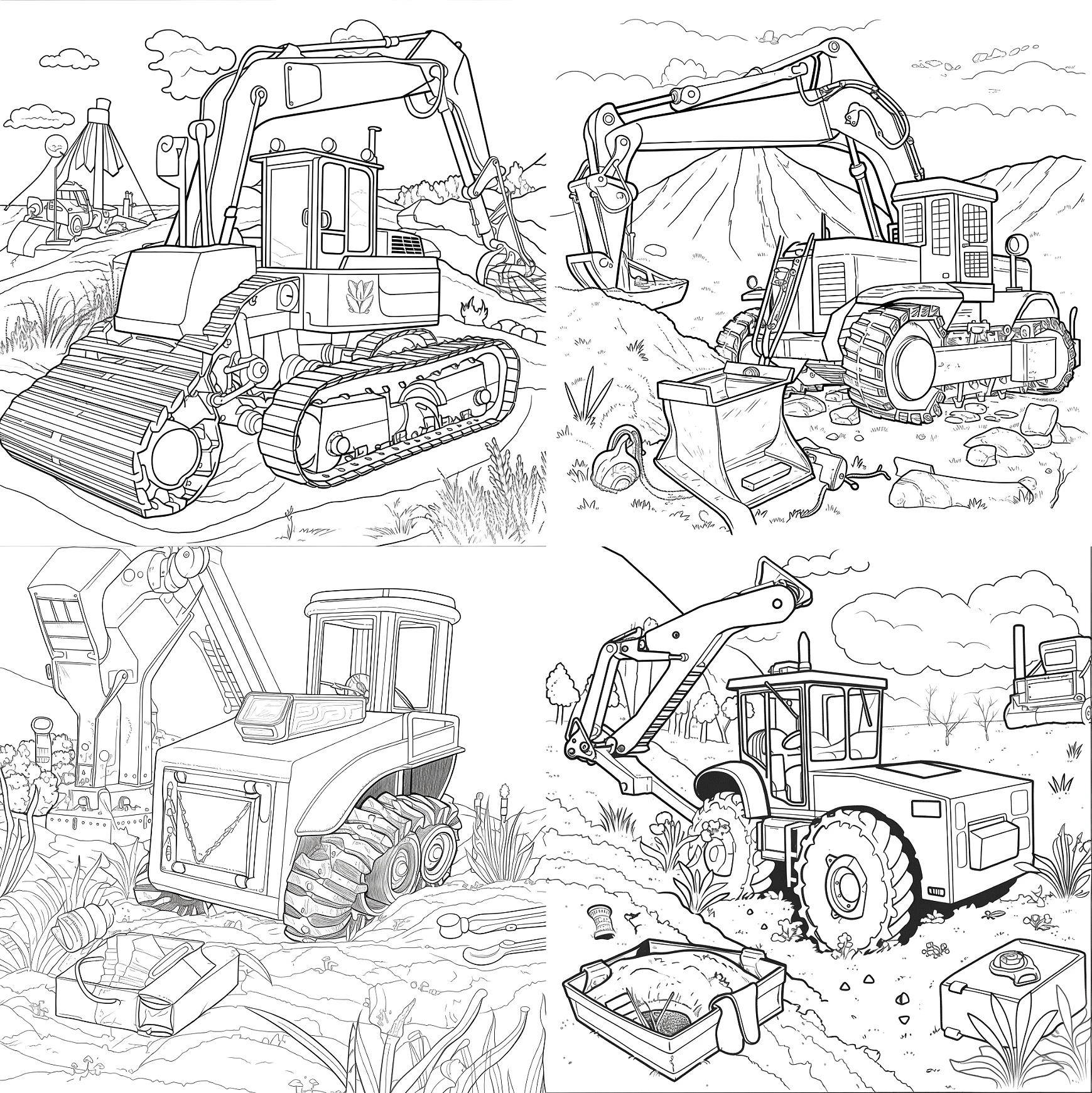 A coloring page featuring a backhoe discovering treasure. The treasure is a box with a combine harvester inside. The box should be in the foreground, with the backhoe in the background. I do not want any children on it. --v 5