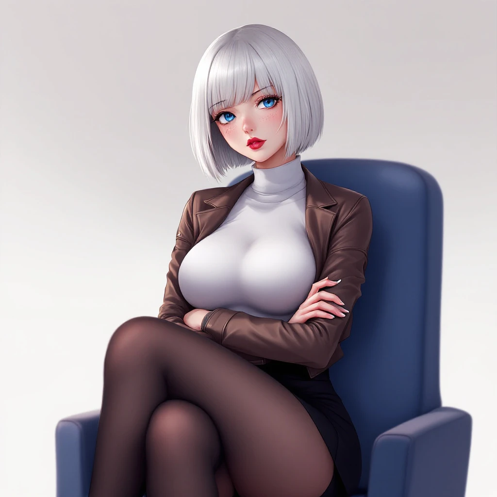 anime, woman, white hair, bob cut, blue eyes, freckles, red lips, white turtle neck sweater, tight turtle neck sweater, short leather jacket, brown leather short jacket, black tight skirt, short skirt, black short stockings, black high heels, bored expression, sitting on a chair, sitting with legs crossed, big chest, cigarette in hand, arms crossed