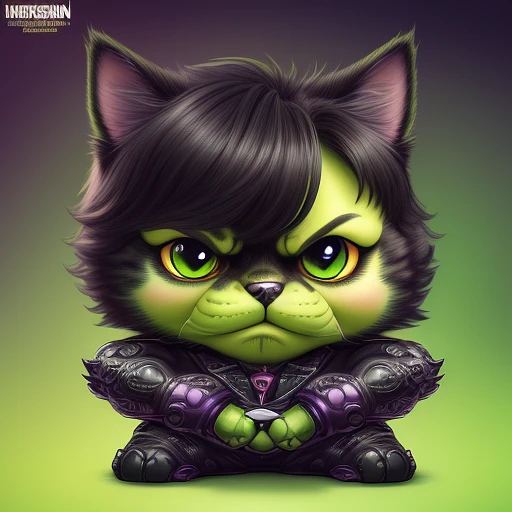Puppy cat with costum hulk elegant computer geek, chibi and real style, masterpiece, realistic photography, colorful background, detailed, intricate details, rich colors, realistic style, --ar 9:16 --s 750 --style raw --v 5. 1