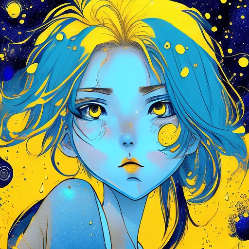 illustration of a girl with blue hair, art print, in the style of dark yellow and light azure, water drops, bold manga lines, the stars art group (xing xing) , i can't believe how beautiful this is, dark yellow and orange, hyper-detailed --ar 71:98 --stylize 750 --v 6