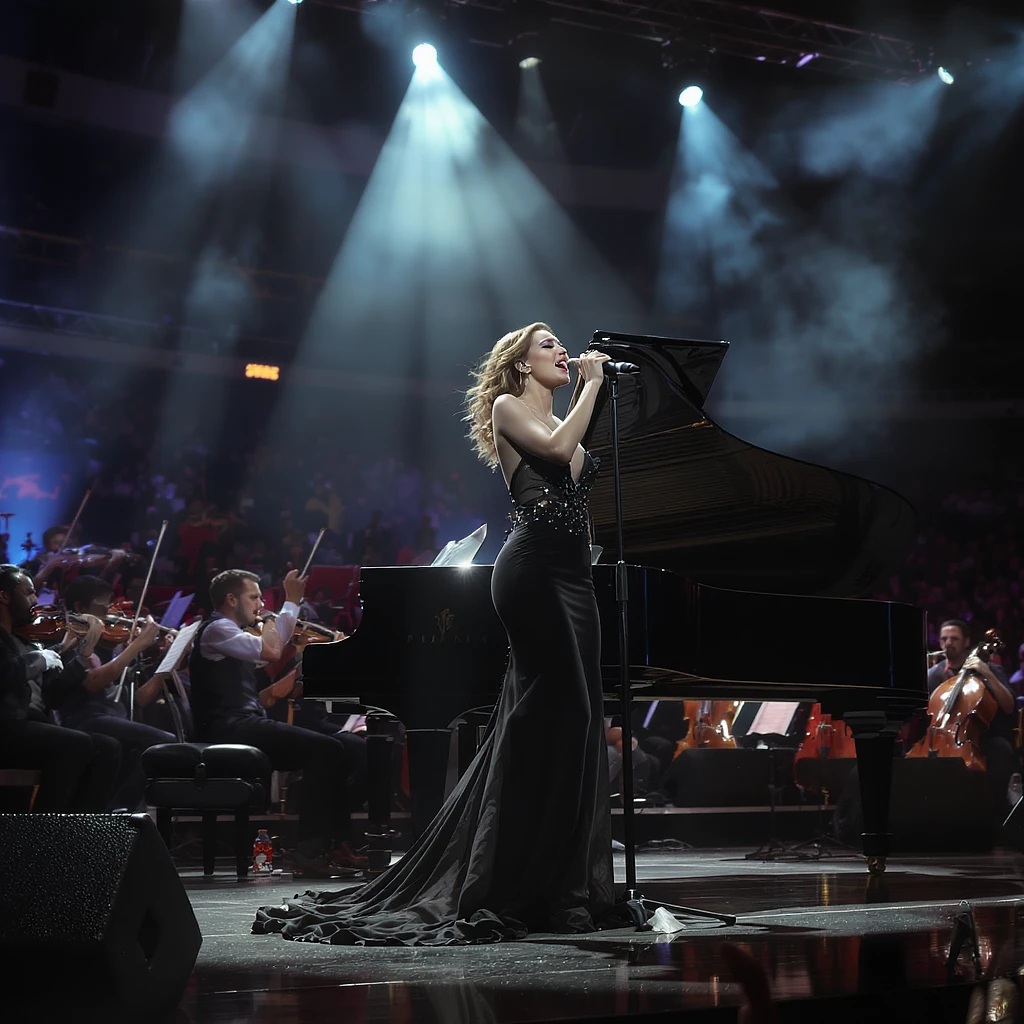 Leona Lewis style female singer on stage, performing a dramatic power ballad, grand piano and orchestra in the background, cinematic lighting with spotlights, flowing elegant gown, stadium audience cheering, soulful and emotional expression, dynamic pose, epic vocal performance, cinematic atmosphere, high detail, realistic, 8k --ar 16:9 --v 6 --q 2