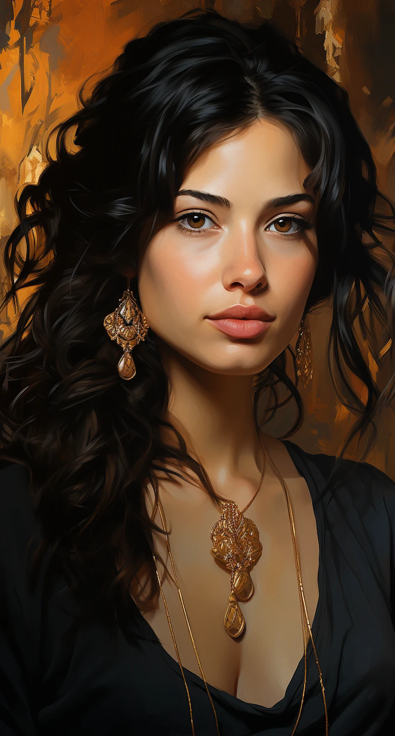a painting of a dark-haired woman wearing gold earrings, in the style of realistic color palette, arabesque, portraits with soft lighting, studio portrait, mesopotamian art, dark white and amber, indian scenes --ar 69:128 --s 750 --v 5. 2