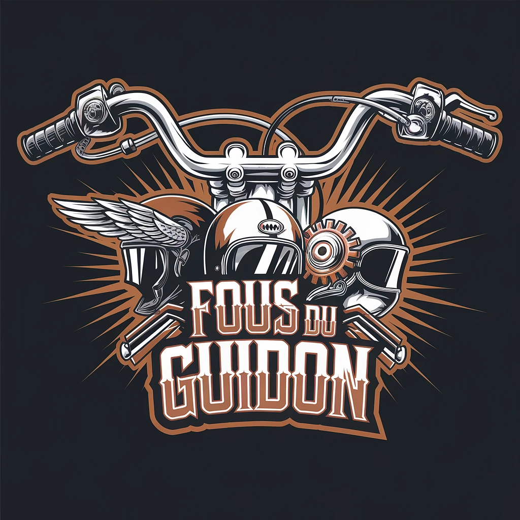 Create a bold and exciting logo for "Fous du Guidon", a brand related to the world of motorcycling. The logo should prominently feature a motorcycle handlebar and several motorcycle helmets, alluding to the brand's connection to the motorcycle world. The design should be in a similar style to the provided reference image, with strong lines, detailed illustrations, and vibrant colors against a dark background. The text "Fous du Guidon" should be bold and integrated into the design, complementing the handlebar motif. To reflect a sense of madness and excitement, add dynamic elements such as swirling patterns, vibrant splashes of color, and exaggerated expressions or designs on the helmets. Incorporate additional elements, such as gears or wings, to enhance the motorcycling theme and add dynamism to the logo.