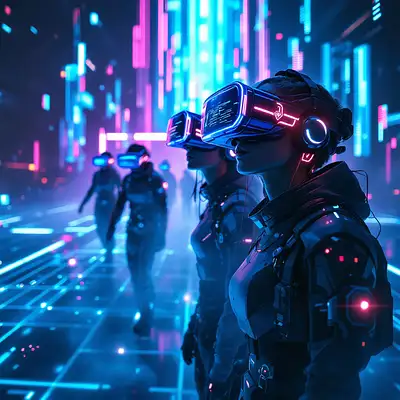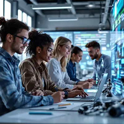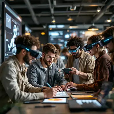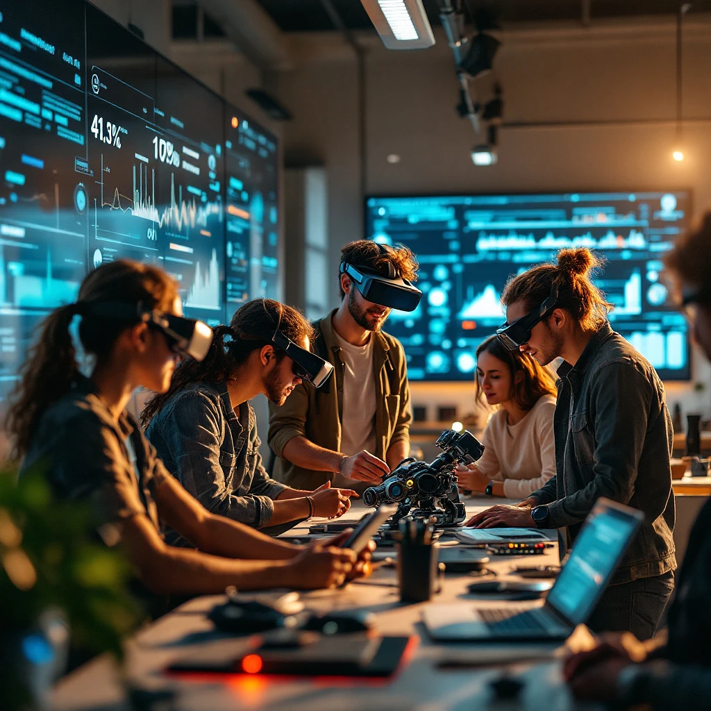 A group of young university students, passionate about technology and innovation, collaborating in a high-tech lab filled with cutting-edge tools. They wear augmented reality glasses, smartwatches, and casual but modern attire, blending a relaxed student vibe with technological curiosity. The environment is a sleek and contemporary workspace with large digital screens displaying AI-driven interfaces, holographic data projections, and interactive prototypes. The students, diverse in background, are actively engaged—one is adjusting a VR simulation, another is brainstorming on a tablet, while others test a robotic device or analyze code on a laptop. The lighting is warm and natural, creating an inspiring atmosphere of creativity and problem-solving. The scene captures the energy of a new generation of technological pioneers, immersed in hands-on exploration and collaboration. The composition is dynamic, with a documentary-style perspective emphasizing authenticity and engagement.