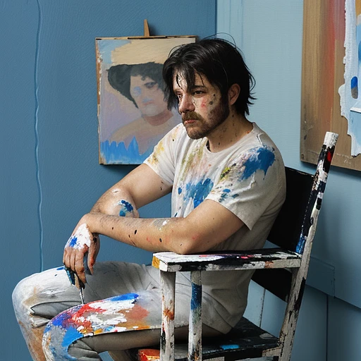 painting of sad man sitting on chair, eyes are teary, holding face, pallet knife painted, thick textured, thick layers of paint