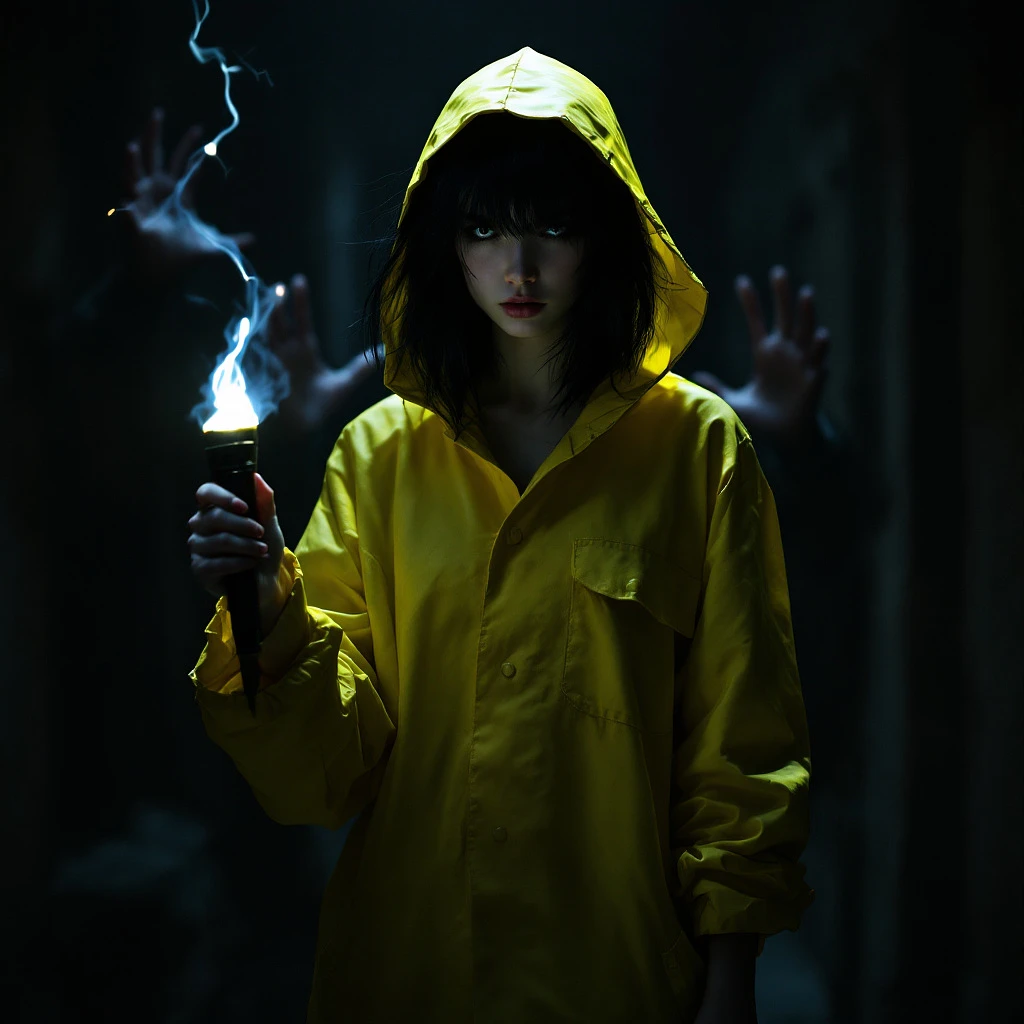 full body view of a mysterious 18 year old woman, with messy black hair cut into a bob and long bangs covering her eyes. He has a pointed chin. no pants. His feet are bare. He wears a short, bright yellow raincoat with a diamond-shaped hood on his head. He proceeds to illuminate the dark in front with an electric torch in his hand, casting a beam into the darkness of what appears to be the hold of a ship. Behind her 2 huge hands reach out from the darkness and are about to grab her.