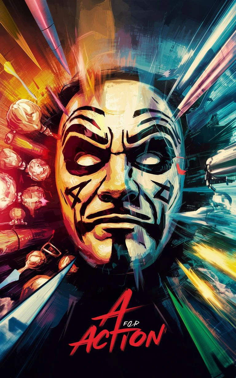 Design a movie poster for "A for Action, " featuring the V for Vendetta mask in a dynamic and energetic artistic style. Use bright colors and moving shapes to create an exciting and stimulating atmosphere, while incorporating design elements that represent action and positive change.