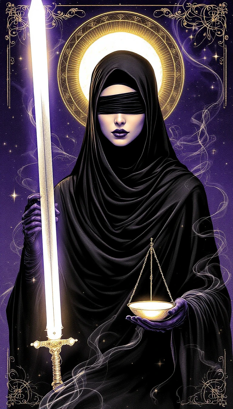 "Shadowed Arbiter with Luminous Balance": A striking depiction of the goddess of justice, veiled in mystery with a blindfold covering her eyes. She wears a radiant black gown that seems to be created from the softest silk. Her right hand cradles a delicate scale, with its fine lines and balanced cups reflecting the ideals of fairness. In her left hand, she grips a large, powerful sword, its surface reflecting the pure, white light of a full moon, representing the power that she uses to right wrongs. The background is a deep violet color with designs that seem to dance like shadowy plumes of smoke. The goddess’s face, highlighted by an ethereal glow, is a magnificent piece of pen and ink drawing, combining subtle colors with metallic shades that create a sense of depth and wonder. The composition is structured within the golden ratio, leading the viewer's eye to the goddess’s mysterious face.